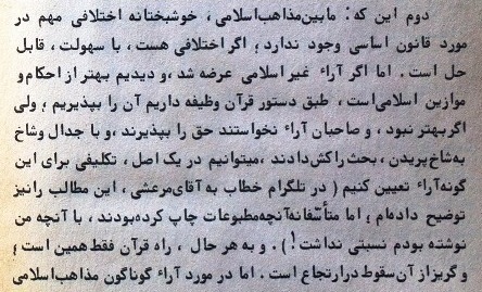 مِنَ الَّذِينَ فَرَّقُوا دِينَهُمْ وَكَانُوا شِيَعًا ۖ كُلُّ حِزْبٍ بِمَا لَدَيْهِمْ فَرِحُونَ (الروم 32) : "لهوانهی که ئاینهکهیان بهشبهش کردووهو بوونهته چهندهها گرۆو دهسته (بڕوایان بهههندێکی ههیهو بڕوایان بهههندێکی نییهو کوێرانه شوێن ڕابهرهکهیان دهکهون) ههر گرۆو پارتێکیش دڵخۆش به بهرنامهو نهخشهو پلانی خۆیان (وا دهزانن چاکترین ڕێبازیان گرتۆتهبهر)". قورئانی پیرۆز ئێمەی لە مەترسیی ئەم جۆرە فیرقانە ئاگادار کردۆتەوە و مەکتەبی ئەحمەدی موفتیزادەش لەو گروپانەیە دڵخۆشن بە ڕێبەر و پارتەکەیان.